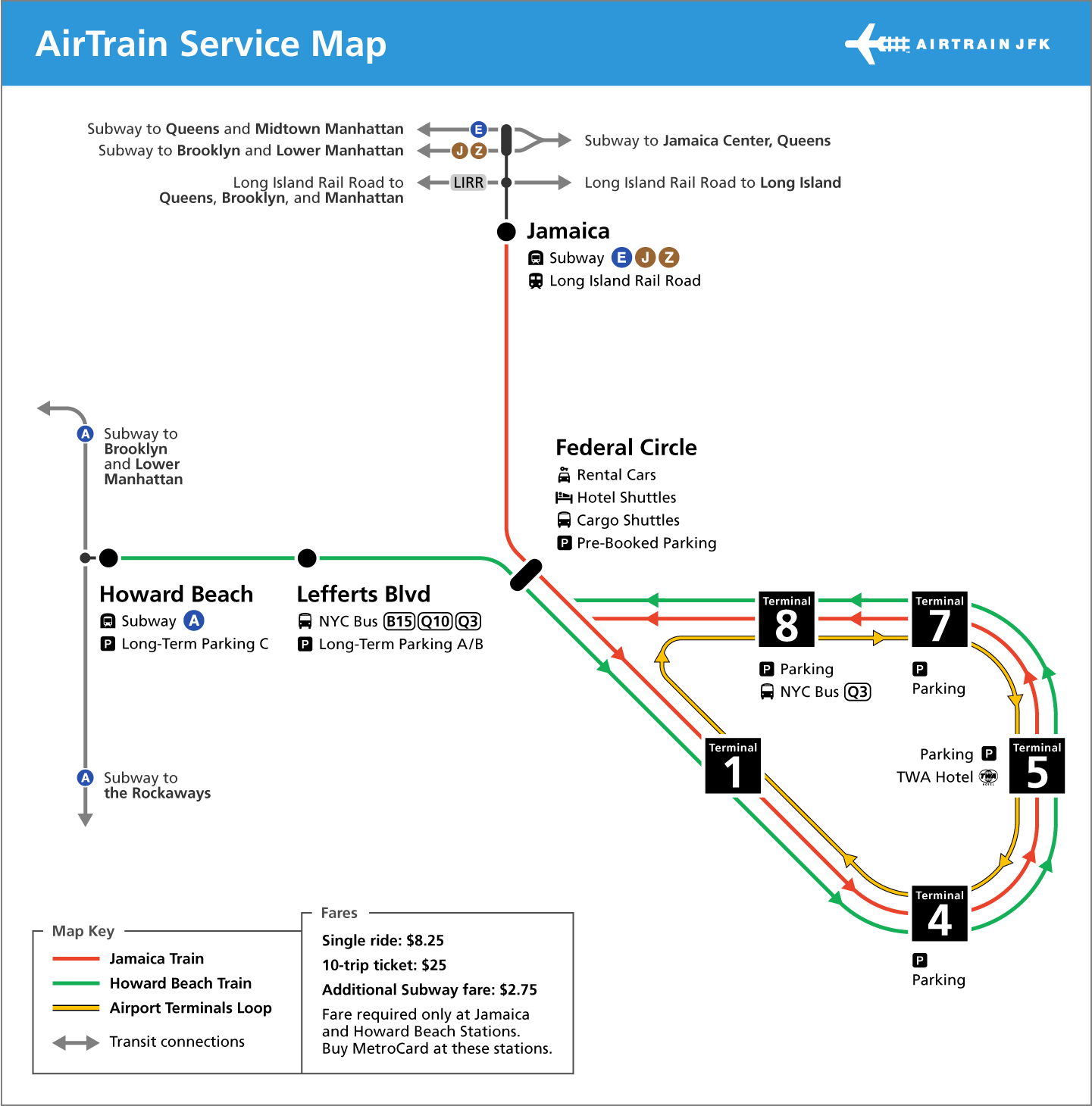 Der AirTrain JFK ist ein automatischer Zug, der die Terminals verbindet und Sie zu den U-Bahn-Stationen Jamaica oder Howard Beach bringt.